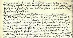 IN THE NAME OF GOD, AMEN. We, whose names are underwritten, the Loyal Subjects of our dread Sovereign Lord King James, by the Grace of God, of Great Britain, France, and Ireland, King, Defender of the Faith, &c. Having undertaken for the Glory of God, and Advancement of the Christian Faith, and the Honour of our King and Country, a Voyage to plant the first Colony in the northern Parts of Virginia; Do by these Presents, solemnly and mutually, in the Presence of God and one another, covenant and combine ourselves together into a civil Body Politick, for our better Ordering and Preservation, and Furtherance of the Ends aforesaid: And by Virtue hereof do enact, constitute, and frame, such just and equal Laws, Ordinances, Acts, Constitutions, and Officers, from time to time, as shall be thought most meet and convenient for the general Good of the Colony; unto which we promise all due Submission and Obedience. IN WITNESS whereof we have hereunto subscribed our names at Cape-Cod the eleventh of November, in the Reign of our Sovereign Lord