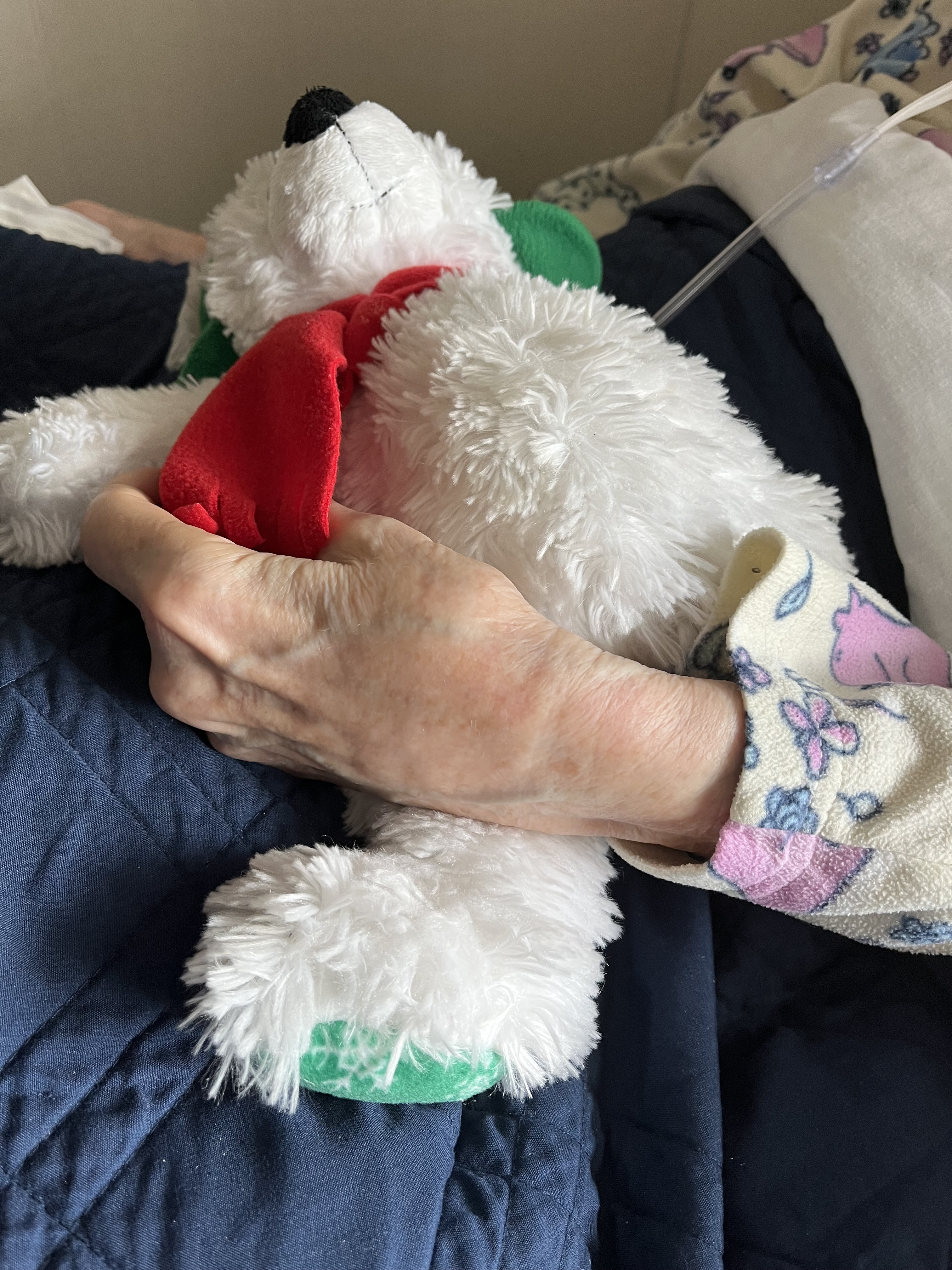 My mother is still with us this Easter, but unfortunately, she won’t be able to join the rest of us around our celebration table. We’ll miss her at the meal, but then we’ll gather around her bed celebrating her life until she enters her eternal home. Meanwhile, she is holding onto a soft bear companion that my granddaughter is sharing with her.