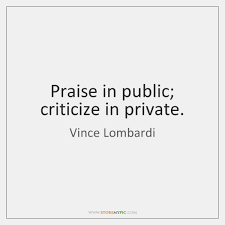 Many years ago, a wiser, older, more mature couple taught us this phrase: praise in public; construct in private. By that phrase they meant to always provide a word of praise for your mate when with your family, at your work place, with your friends or in any social setting. They also encouraged us to never, ever put our mate down, shame them, humiliate them or correct them in a negative sense in public. We took this counsel to heart and have adapted it for our marriage relationship.